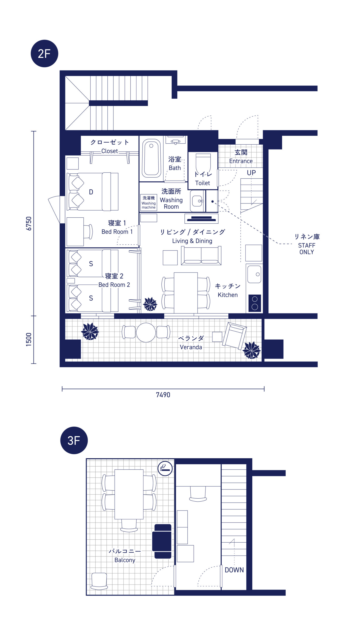 ご家族、ご友人や仕事関係でもゆったりご利用いただけるように寝室は2部屋、ベッドが3台、和布団2セットがございますのでお好きなスタイルでお泊まりになれます。