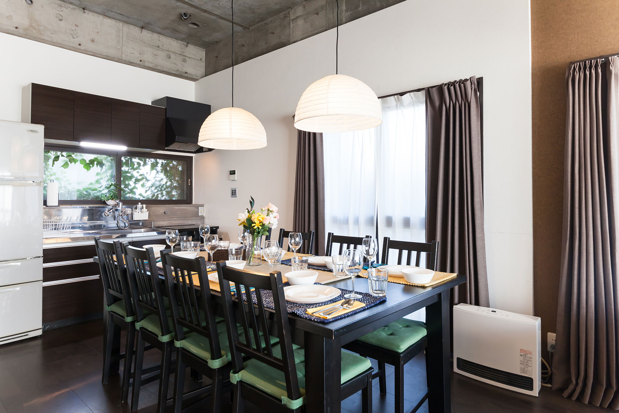 ご家族、ご友人と食事をしたり、ソファでくつろげるリビングダイニングは元々2部屋だった空間を1つの空間にしたのでとても広くお使いいただけます。大人数でも圧迫感が出ない高い天井や大きな窓も考えて設計しております。